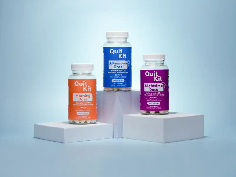 Quit Kit Recovery Regimen is a science-informed blend of 12 ingredients like L-Dopa, NAC, and Ashwagandha to ease withdrawal cravings, boost energy, and support mental clarity. Its three daily doses align with your body’s rhythm for optimal support.
